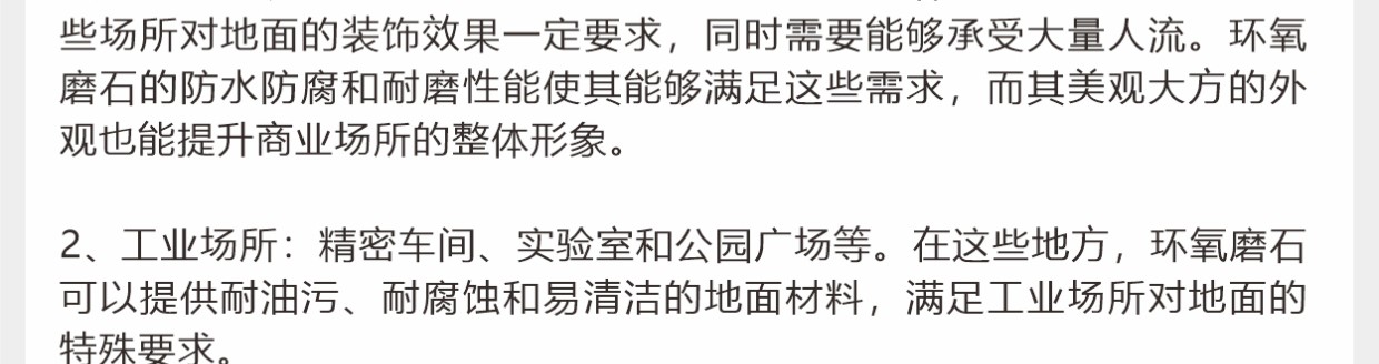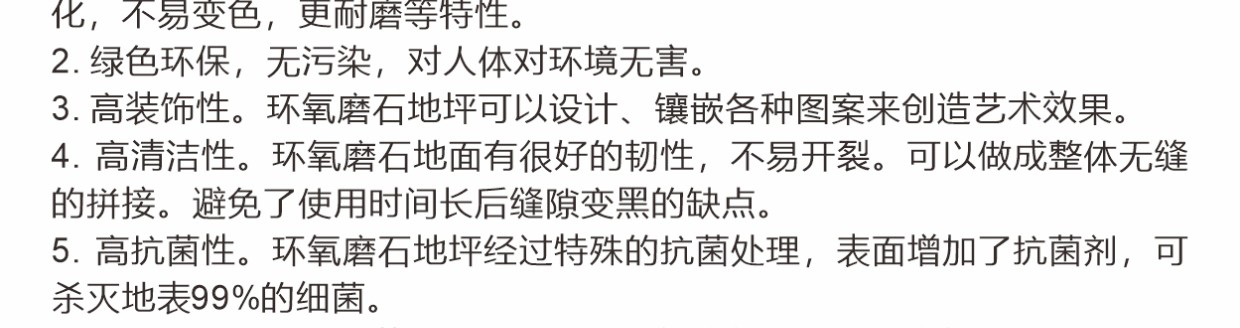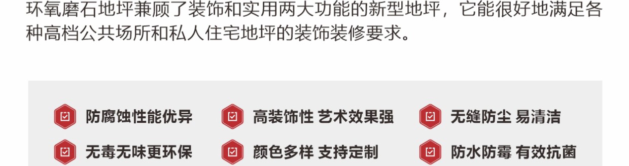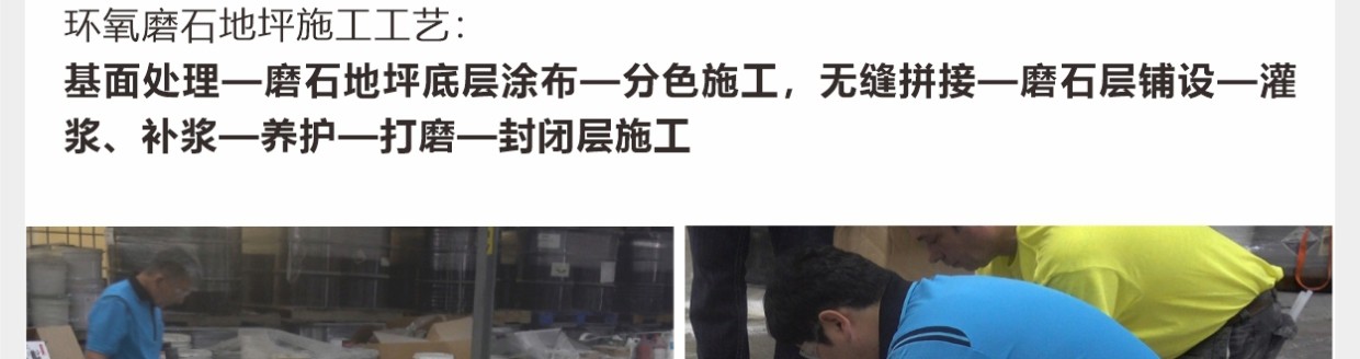彩田環(huán)氧磨石地坪是以環(huán)氧樹脂為粘接料,以天然石材粒、金屬顆粒、玻璃粒、合成碎?;蚱渌b飾性材料等天然骨料,模仿水磨石地坪施工工藝的有機磨石地坪。環(huán)氧高分子樹脂,與各種骨料混合后經(jīng)現(xiàn)場澆筑(攤鋪)、研磨、拋光等經(jīng)過20多道精湛工藝而打造出的一種整體無縫的裝飾性地面。環(huán)氧磨石地坪除滿足正常的功能性需求以外,還可以滿足地坪裝飾性,還具有較高的藝術(shù)觀賞價值。