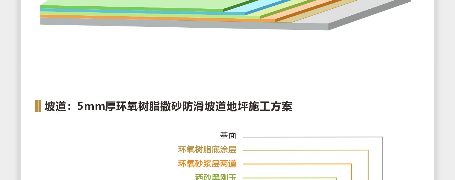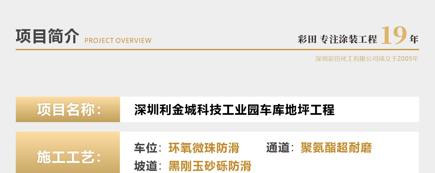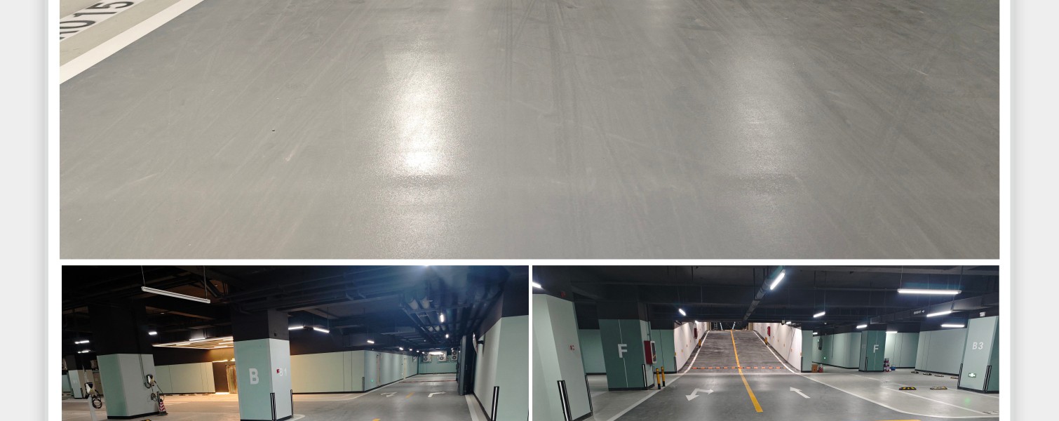 項目名稱:/深圳利金城科技工業(yè)園地下車庫地坪工程施工工藝:/車位:環(huán)氧微珠防滑 通道:聚氨酯超耐磨 坡道:黑鋼玉砂礫防滑施工面積:施工工期:色彩搭配方案:涂裝體系結(jié)構(gòu):